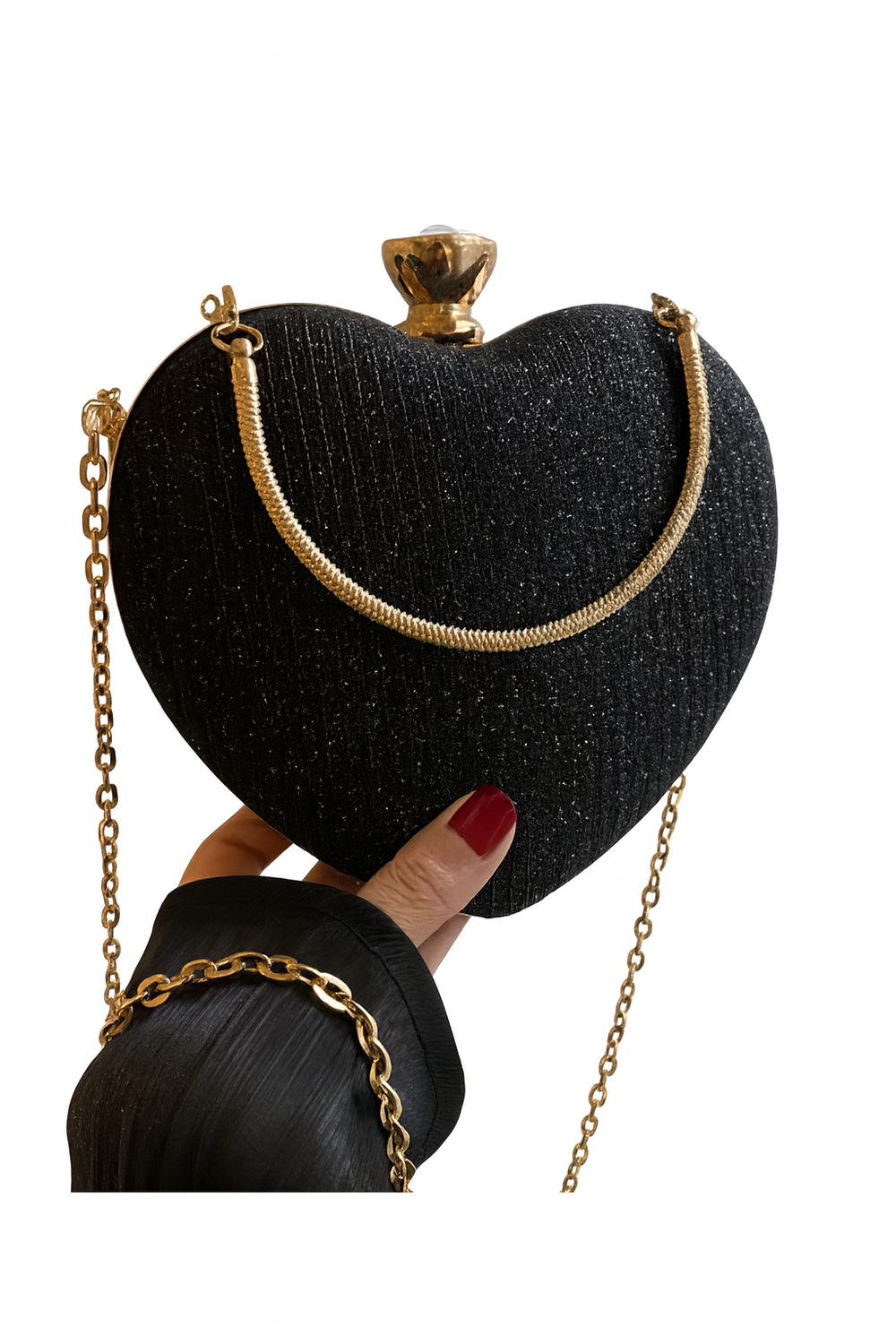 Add a touch of sparkle to any outfit with our Heart-Shaped Luxury Mini Bag.